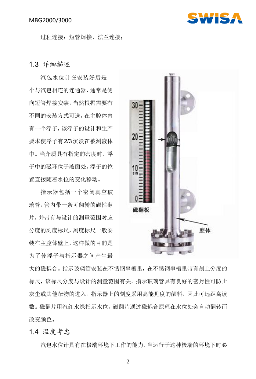 汽包水位计的基本结构包括浮子、主腔体和指示器。主腔体与汽包直接相连。主腔体内含一个磁性浮子,在测量时浮子有2/3浸在过程液体内。与主腔体连在一起的指示器包括一个密闭真空玻璃管,管内带可翻转的磁翻片,并带与设计的测量范围对应的分度标尺。指示器与主腔体之间使用喉箍固定,当浮子随着液位的变化而改变位置时,磁翻片通过磁耦合的原理,将会跟着浮子的升降发生相应的翻转。双色汽包水位计所具有的坚固的结构,使其可应用于操作条件极为苛刻的汽包水位计测量场合。